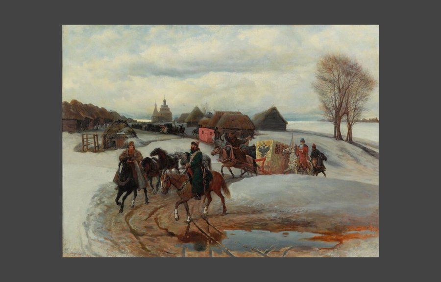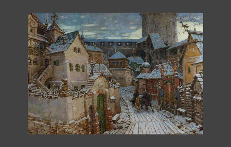 Гонцы. Ранним утром в Кремле. 1913. Масло. Васнецов Аполлинарий \ Вешний поезд царицы на богомолье при царе Алексее Михайловиче. 1868. Масло. Шварц Вячеслав