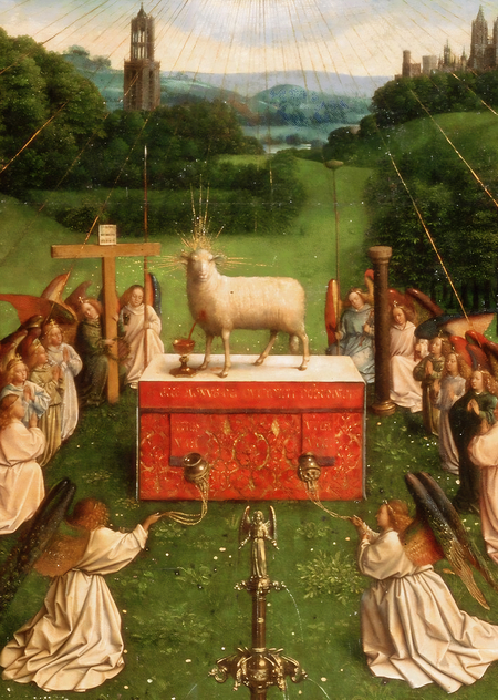 Это алтарь, на котором стоит Агнец Божий, окружённый ангелами, что отсылает к литургической и эсхатологической концепции.