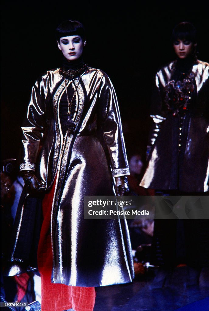 Коллекция «Opera Ballets Russes» 1976 года демонстрировала сочетание театральной эстетики и элегантного layering: многослойные платья, лёгкие жакеты и длинные накидки создавали динамичные силуэты и визуальный ритм, вдохновлённый костюмами русского балета. Saint Laurent активно играл с пропорциями и контрастом материалов прозрачные и плотные ткани, драпировки и вышивки накладывались слоями, формируя эффект движения и сложной фактуры, что перекликалось с уличной модой через журнальные публикации и фотоснимки.