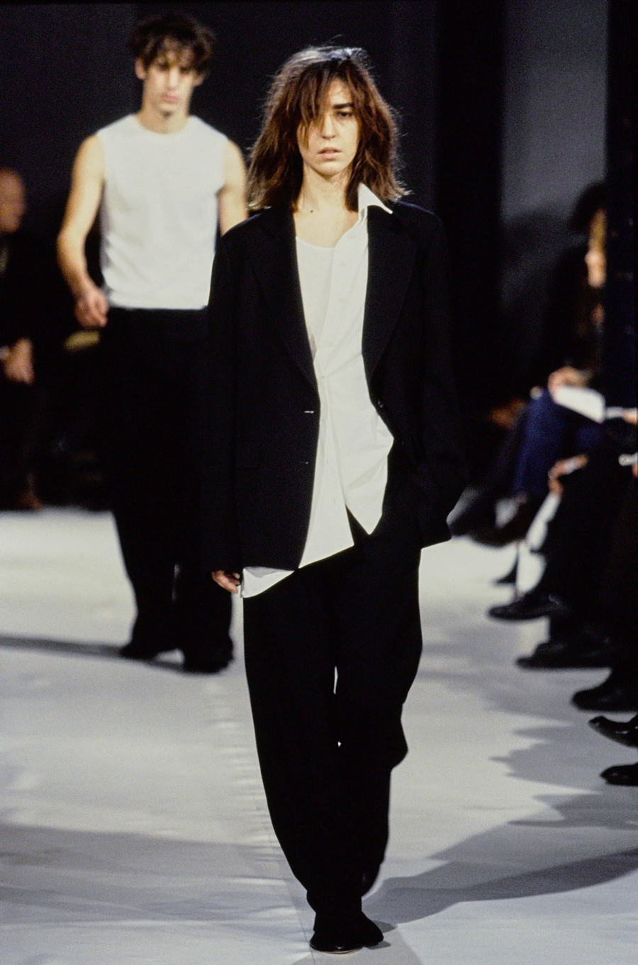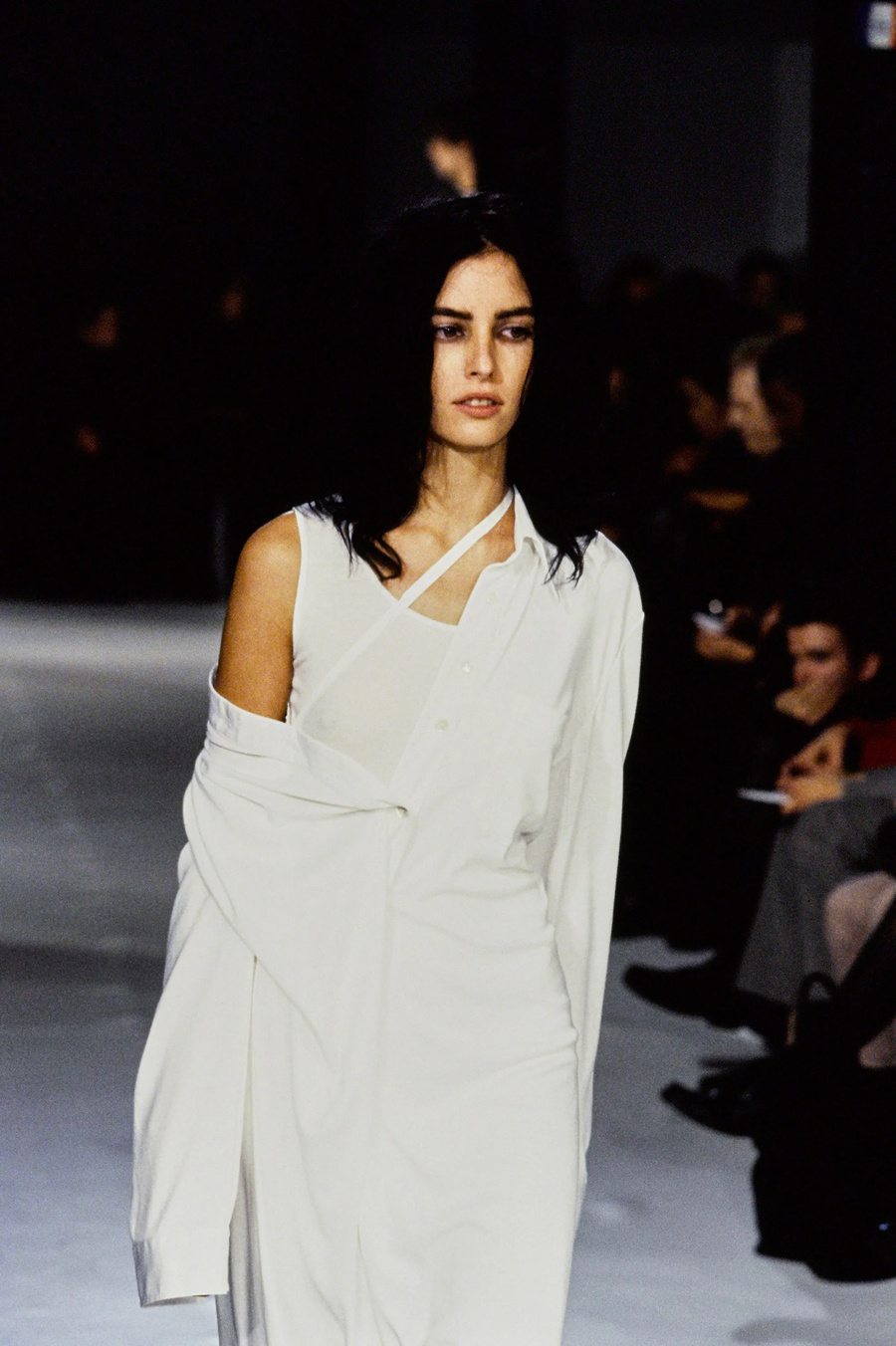 В весенней коллекции 1997 года Ann Demeulemeester создает слоистую структуру, напоминающую легкую, прозрачную архитектуру, окутывающую тело. Силуэт вытягивается, ткани становятся воздушными, появляется асимметрия и игра света и тени. В то время как уличные бренды того же периода используют слои более практично: объемные худи, куртки, броская графика, логотипы, принты и плотные ткани. Если стритвир создает впечатление большого объема и визуального шума, то Ann Demeulemeester дарит ощущение легкости, простора и тишины, где каждый слой — это скорее штрих рисунка, чем элемент защиты или заявление о принадлежности к субкультуре.