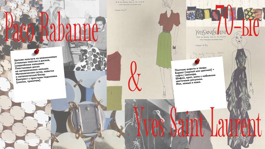 В 1970-е годы высокая мода экспериментирует с формой и материалом. Yves Saint Laurent сочетает плотные и мягкие ткани, создавая строгие, но плавные силуэты; Paco Rabanne использует металлические пластины и модульные конструкции, превращая материал в самостоятельный слой. В 1980-е layering становится инструментом драматизации и эксперимента с формой. Comme des Garçons создаёт асимметричные композиции из тканей разной длины и фактуры, размывая привычные линии силуэта, а Jean Paul Gaultier использует контраст плотного и прозрачного, мягкого и жёсткого, создавая театральный эффект.