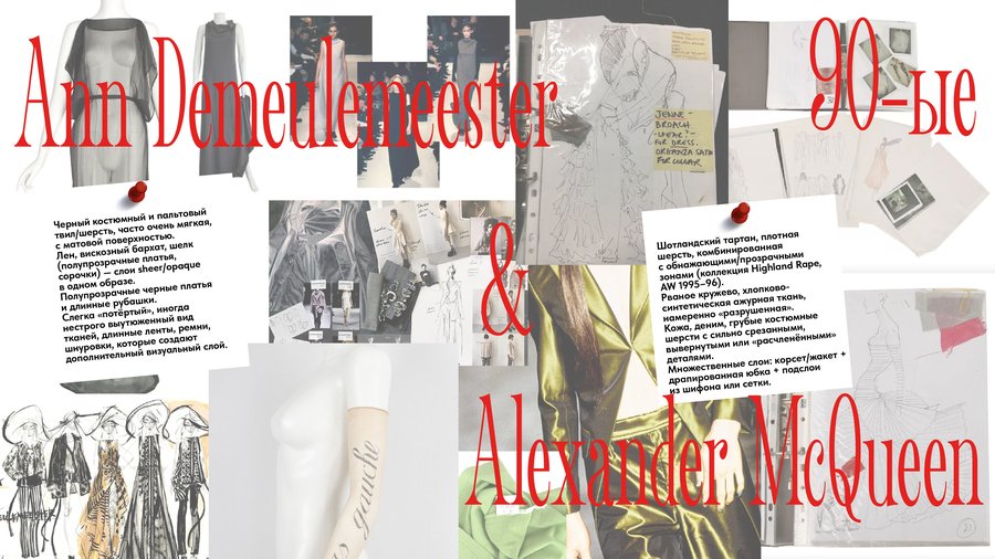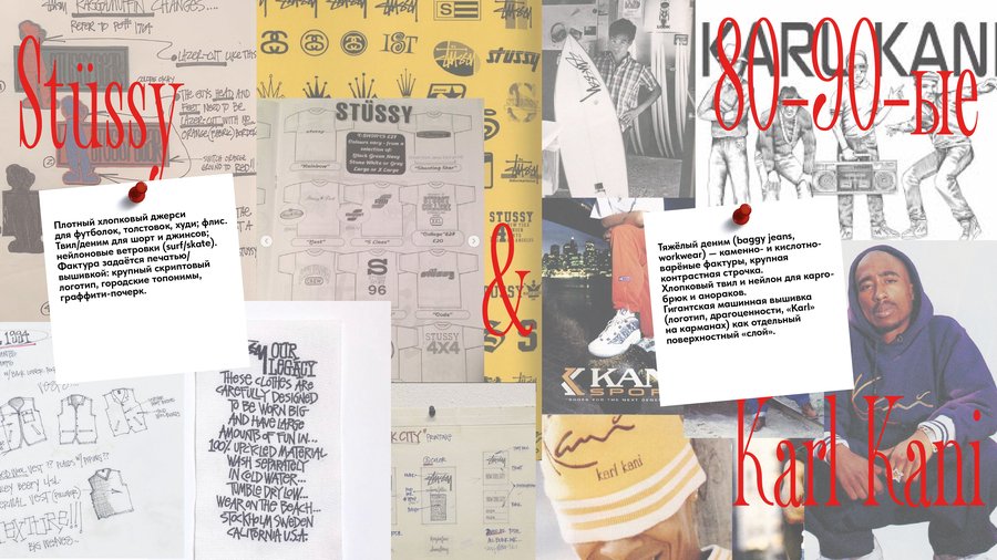 Конец 1990-х объединяет эксперименты с минимализмом и деконструкцией: Ann Demeulemeester с приглушёнными цветами, тонкими слоями и поэтичностью и ранние коллекции Alexander McQueen с драматическим театральным подходом к формам и текстурам. В стритвире 90-х акценты делают Supreme с графичными логотипами и коллаборациями, Karl Kani с яркими, oversized силуэтами и хип-хоп эстетикой.