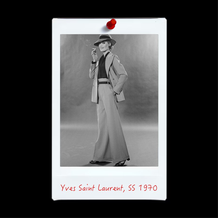 Коллекция 1970 года демонстрировала смелое сочетание элегантности и свободы движений: длинные свободные платья, широкие брюки и жакеты с мягкой драпировкой создавали эффект layering и визуального объёма. Saint Laurent активно экспериментировал с цветом и фактурами, сочетая яркие оттенки и контрастные материалы, что позволяло создавать динамичные, многослойные образы, легко адаптируемые в уличную культуру.