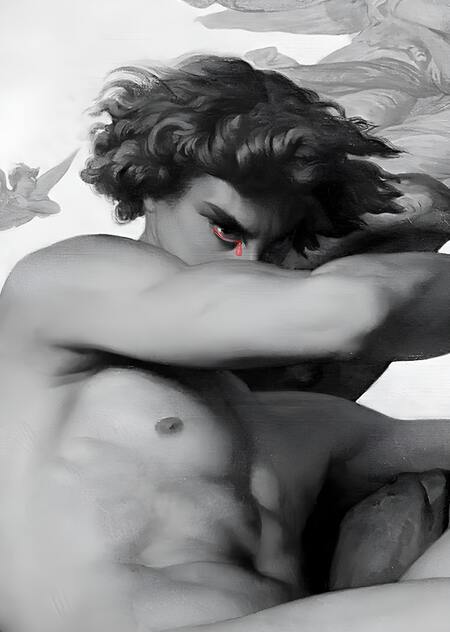 В картине «Падший Ангел» мы видим известный сюжет падения ангела Люцифера и его отвержения Небесами. В центре картины обнажённый юноша, прикрывающий лицо рукой, однако даже по его покрасневшим глазам, одинокой слезе и нахмуренным бровям можно с точностью сказать, что он чувствует — обиду и гнев.