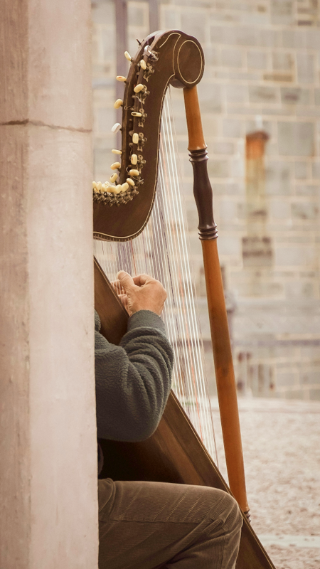 Плавные волокна ткани или шерсти представлены мягкими волнами и тёплыми градиентами, словно теплое, обволакивающее звучание арфы.