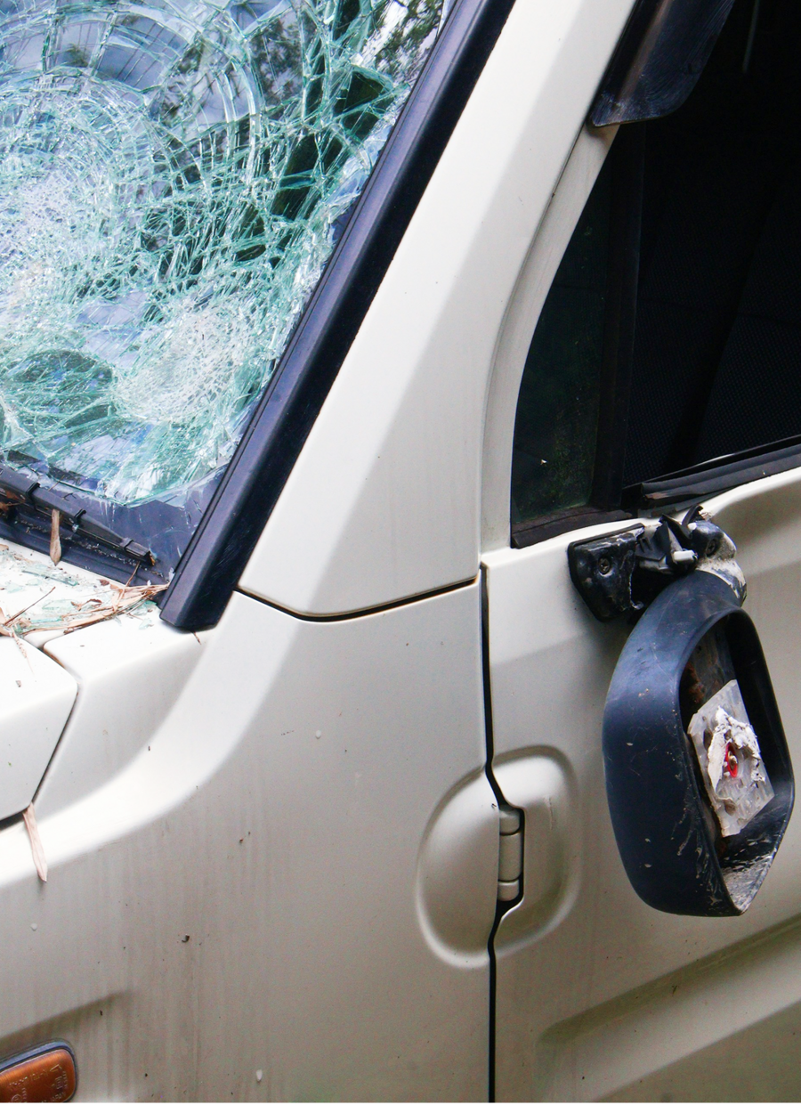 Агрессия, потеря контроля: разбитое стекло автомобиля, следы от шин, авария.