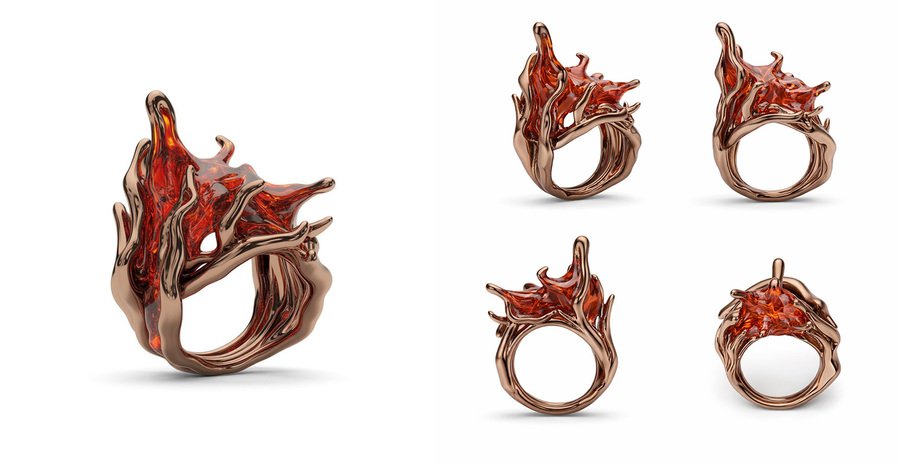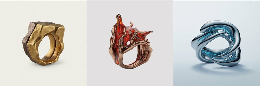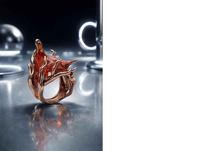 Например, данный промт использовался для генерации кольца Fire: «A sculptural ring inspired by the element of Fire, fully visible in frame, entire ring shown, no cropping, sharp dynamic form with flame-like angles, expressive aggressive geometry, contrasting matte and glossy surfaces, molten metal details, red amber and copper color palette, sense of heat and energy, centered composition, dramatic studio lighting, pure white background, high-end jewelry product visualization»