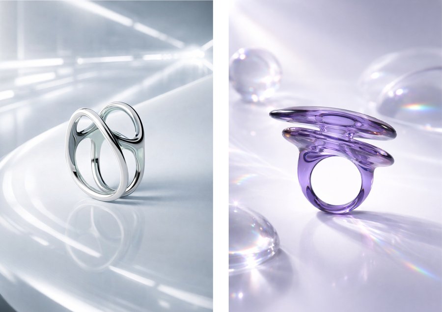 create promo photography for this ring collection, simple and futuristic editorial style, no text, no logos