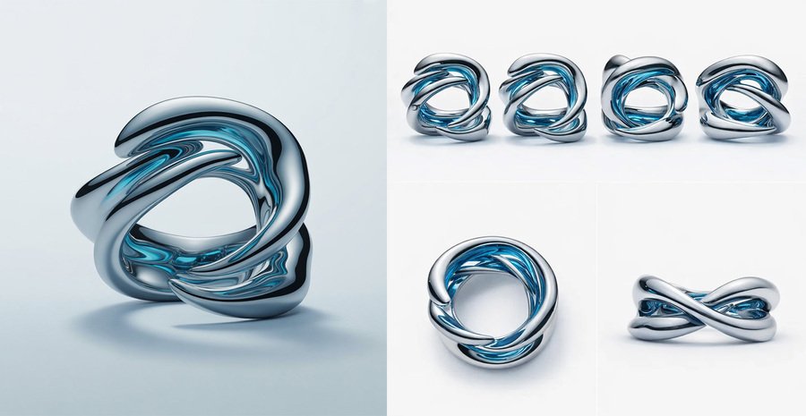 Далее в нейросети Sora я сгенерировала промо-изображения всей серии и отдельно каждого изделия с промтом: «create promo photography for this ring collection, simple and futuristic editorial style, no text, no logos».