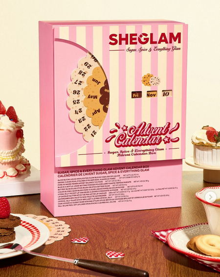 Адвент-календарь Sheglam 2025 года — это пример того, как масс-маркет бренд использует визуальный язык «глянца» и поп-эстетики, превращая упаковку в часть продукта. Основная идея строится на сахарно-карамельной эстетике, подчеркнутой блестящими текстурами, градиентами и «лаковой» поверхностью.