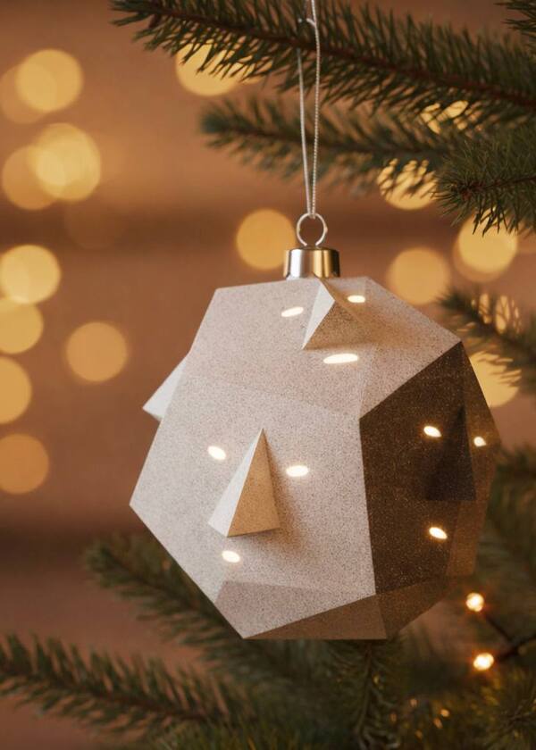 Эта елочная игрушка переосмысляет традиционное новогоднее украшение через язык современной формы и света. Геометрическое тело, собранное из четких граней и выступающих плоскостей, отсылает к архитектуре и кристаллическим структурам, символизируя порядок, устойчивость и внутреннюю силу.