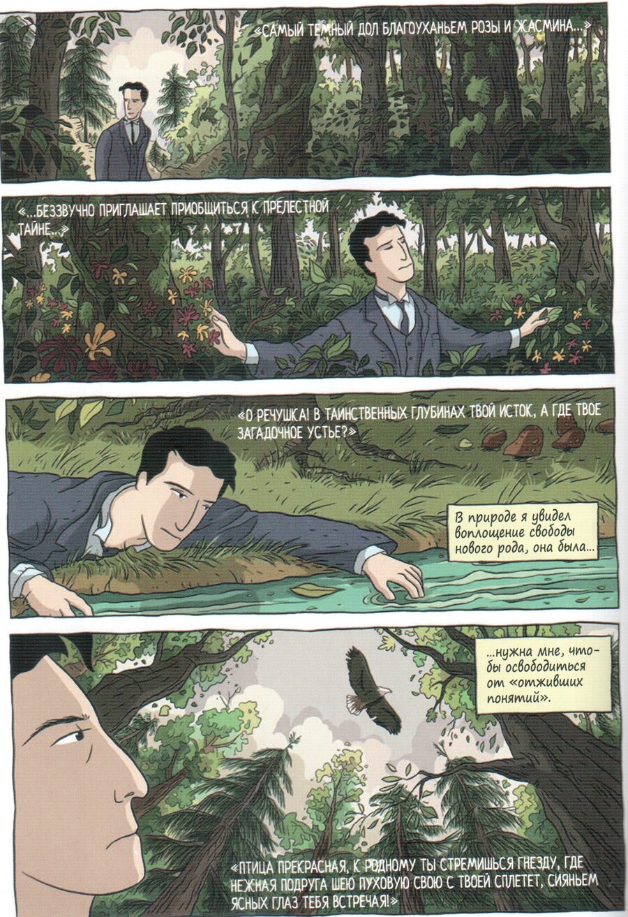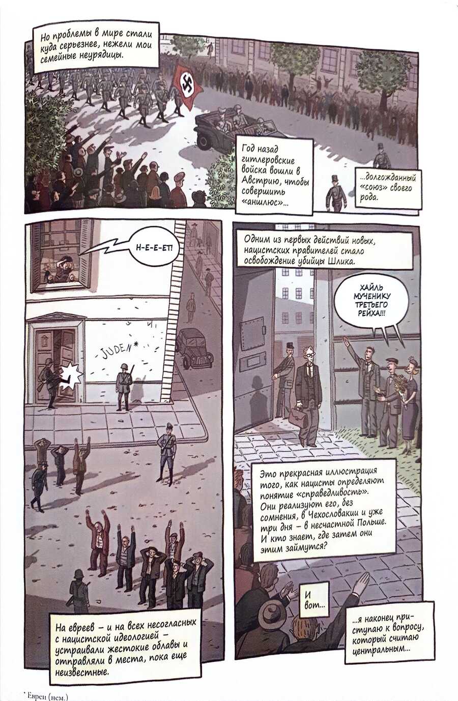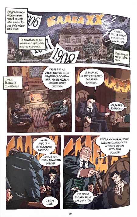 На страницах выше (ил. 8-10) наблюдается переход между тремя слоями: обсуждение комикса в Афинах — сумасшествие сына Гилберта — лекция Рассела в Вашингтоне.