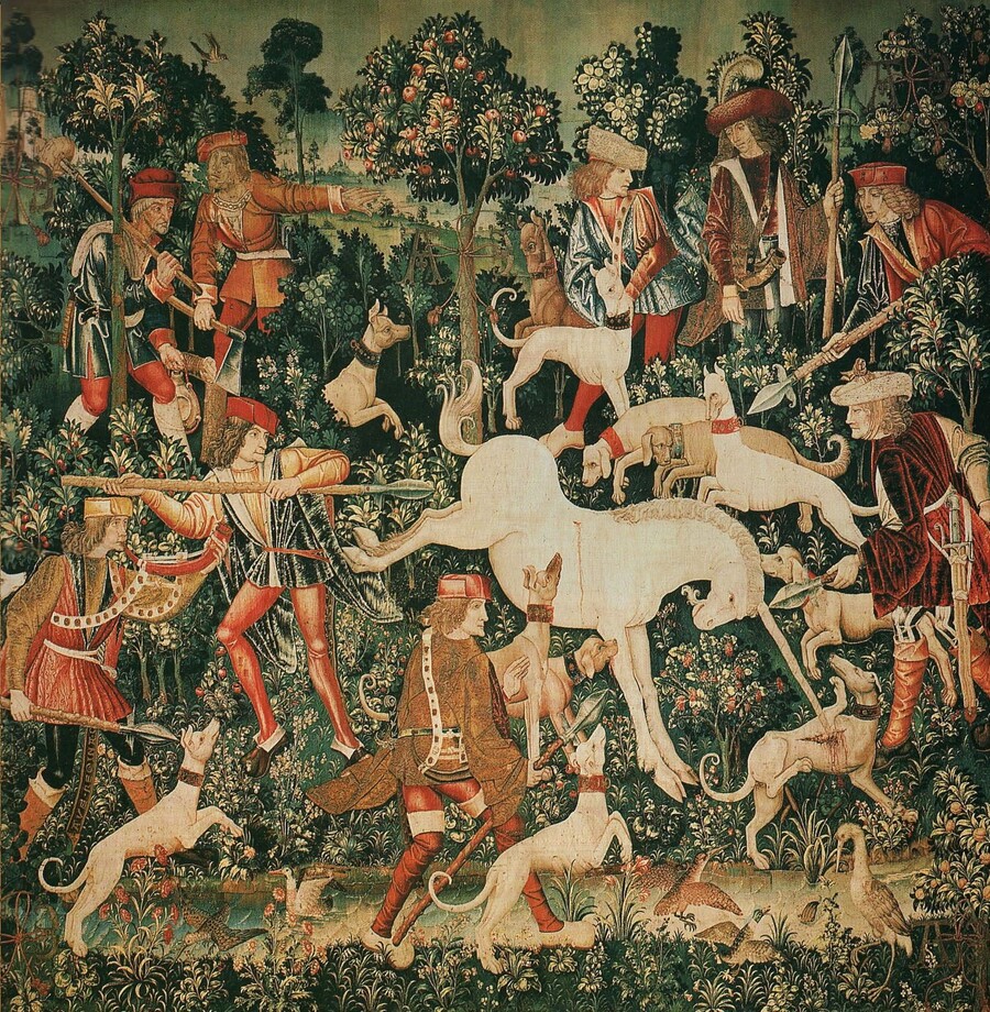 Особое место занимал единорог — образ чистоты и Воплощения. Его история визуально рассказывалась через сцену «охота на единорога»: прекрасное белое создание, укрощенное девой, становилось добычей охотников. Эта сцена, детально проиллюстрированная в бестиариях и позднее на шпалерах, читалась как аллегория Благовещения, где Христос, словно единорог, находит приют в лоне Девы Марии, а затем приносится в жертву.