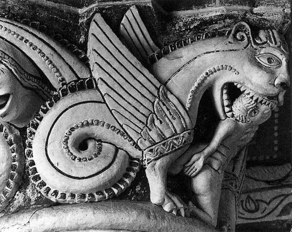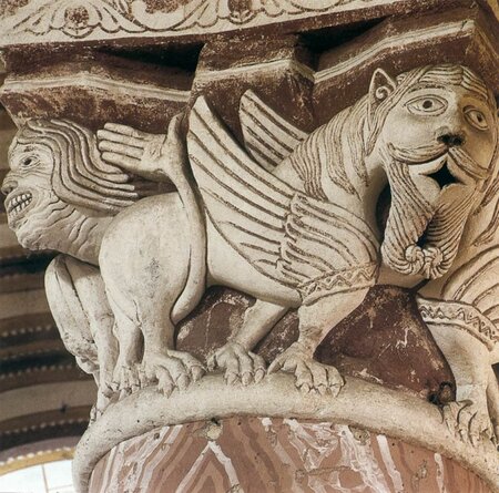 1. Рельеф «Грифон» капители из церкви Сен-Пьер в Шовиньи, Франция, XII век. 2. Рельеф капители колонны в церкви Сен-Пьер в Шовиньи, 2-я половина XI века.