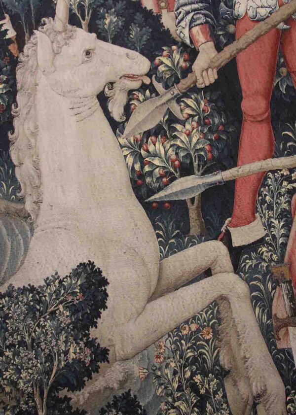 «Единорог у фонтана» — фрагмент одной из семи шпалер серии «Охота на единорога». Оригинал хранится в Клойстере, филиале Манхэтенского музея Нью-Йорка.