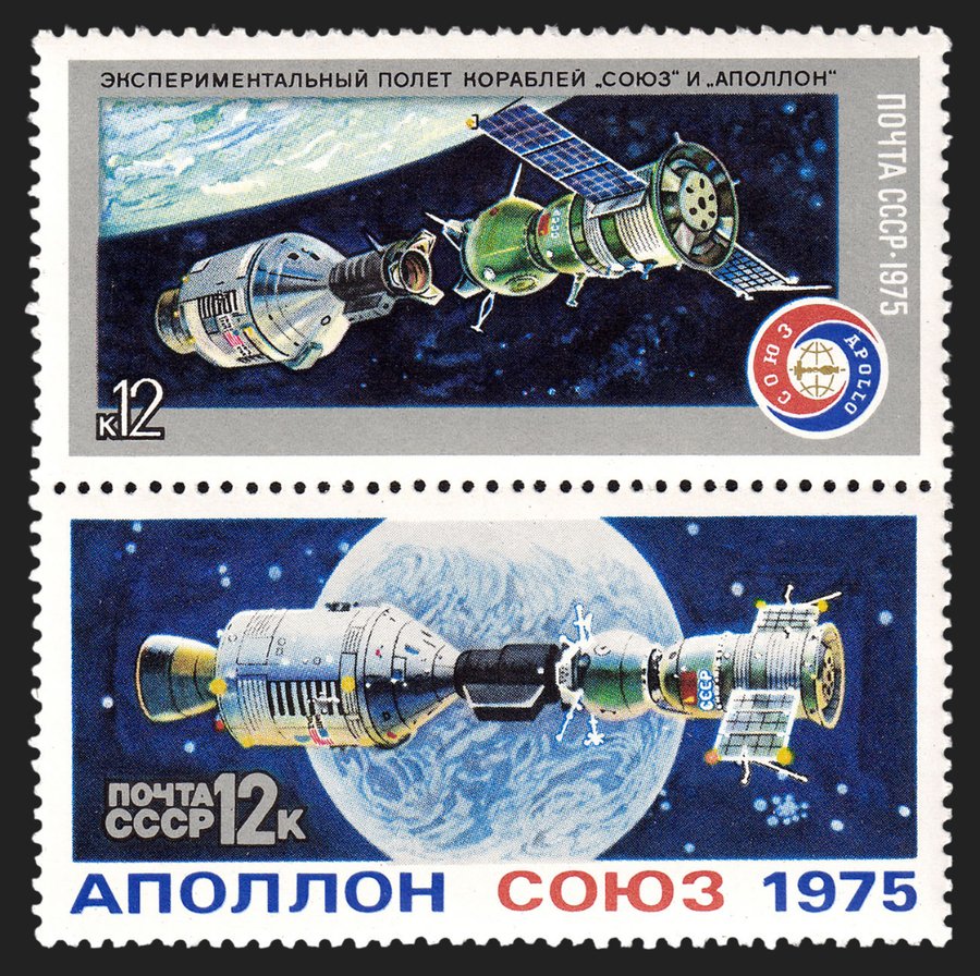 Первый партнёрский полет состоялся с США в 1975 году. Этот сюжет отразился на серии марок, где центральным объектом являются корабли «Союз» и «Аполлон» в моменте стыковки и уже её успешного завершения. Марки символизируют сотрудничество двух держав.