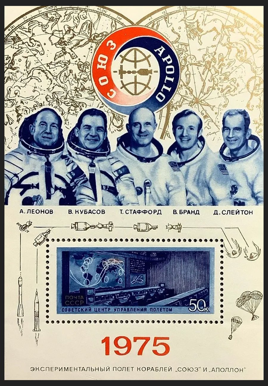 Почтовый блок к этому событию также транслирует эту идею, но уже с участием людей — космонавтов СССР и Америки, которые запечатлены рядом, и центра управления полётом.