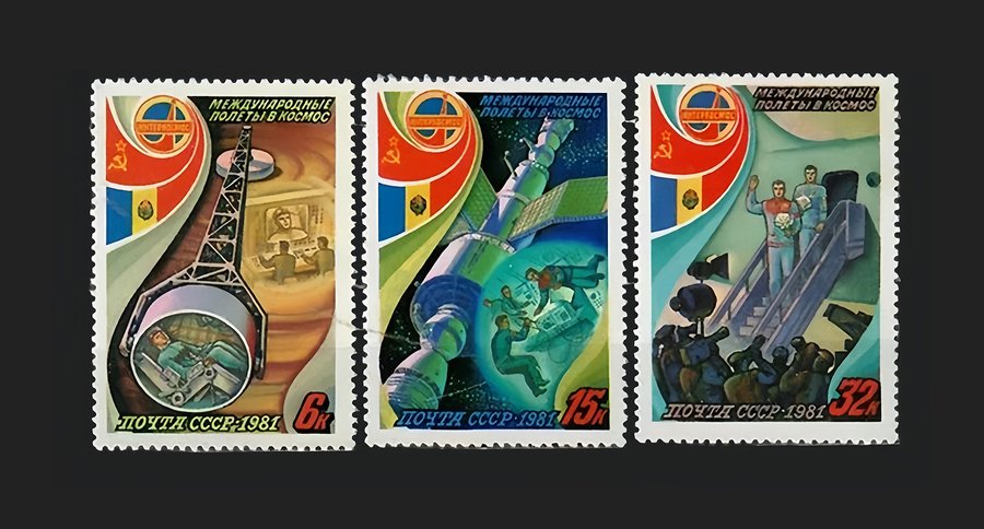 В 1981 году выходит серия марок, сцепленных попарно — в одной части используются цитаты ключевых фигур (Ю. А. Гагарина, С. П. Королёва и Л. И. Брежнева), а в другой символические изображения космических достижений. Цветовая палитра сводится к синему и красному цвету, как дихотомия космической темы и национальной гордости. Изображения на марках закрепляют морально-историческую значимость события. Эта серия яркий пример идеологически нагруженного дизайна.