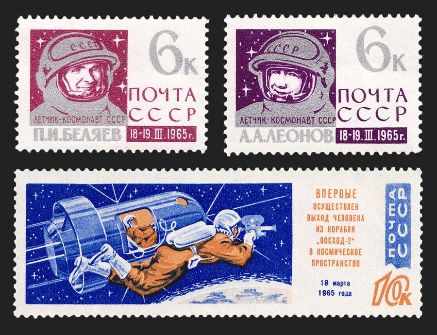 Серии марок о первом выходе человека в открытый космос продолжают традицию портретного реализма с изображением космонавтов в минималистичной цветовой гамме.