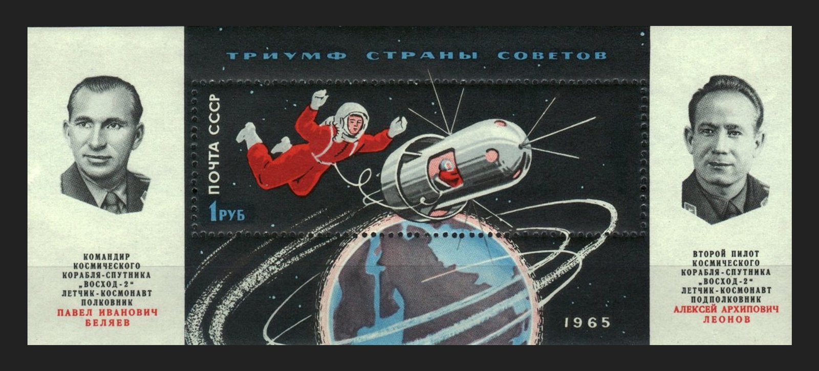 В 1965 году выпускается серия из трех марок, которая прославляет космический подвиг. Композиция строится на вертикалях, что придаёт событию монументальности и торжественности. Национальный триумф подчёркивается красным акцентом на фоне основной холодной «космической» палитры. Присутствует использование визуальных цитат из советской скульптуры, что характерно для того периода.