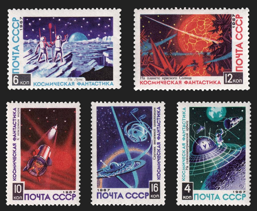 Серия «Космическая фантастика» знаменует собой радикальный отход от документализма к чистому жанру научной фантастики. Композиционно марки представляют собой миниатюрные, насыщенные фантастическими деталями футуристические пейзажи с пришельцами, инопланетными спутниками и красным солнцем. Яркая нереалистичная цветовая палитра и световые эффекты создают ощущение чуждого, но манящего мира.