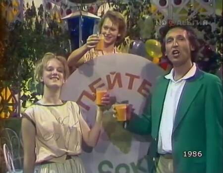 Кадры из рекламы «Соковыжималка». Исполнитель песни и главной роли — Вячеслав Малежик (1986 г.).