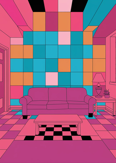 \ промт: make very abstract poster inspired by the most popular sitcoms aesthetic without any text on the image, just pictures. it can be a sofa in the middle of the room.