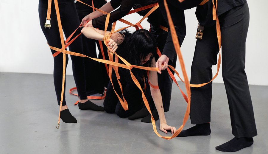 В финале перформанса участники настолько плотно друг к другу пристегнуты, что не остается никаких других вариантов кроме как действовать совместно (и зафиксировать себя общими усилиями как нечто целое).