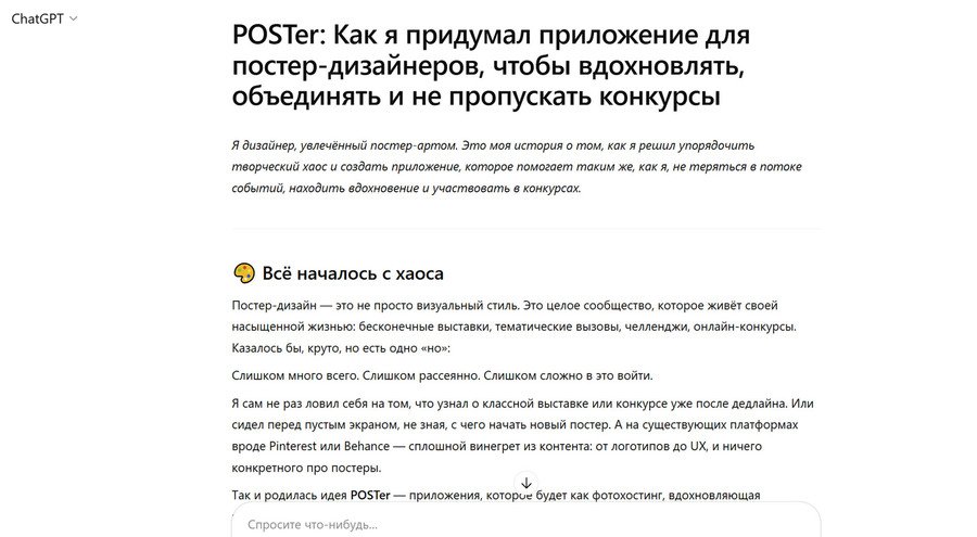 Также понравившийся вариант статьи я отправила снова в Perplexity, чтобы нейросеть добавила в неё больше ключевых слов для SEO продвижения: такие как дизайн, приложение, постеры и тп.