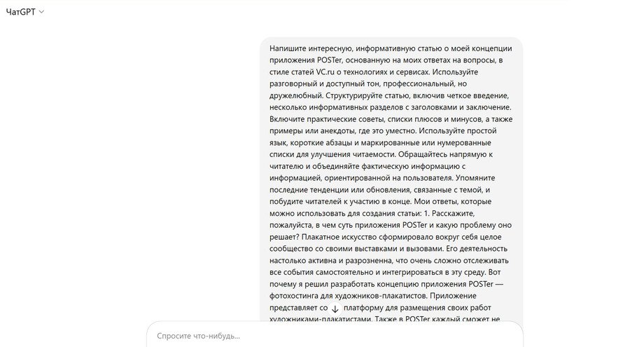 После этого я отправила свои ответы, требования к тексту из курса и промт стилистики для статьи в Chat Gpt, попросив его создать текст на основе этих данных. Выбор пал именно на эту нейросеть, поскольку мне нравится какой живой и гибкий текст она может создавать, включая в неё и юмор и разговорные фразы.