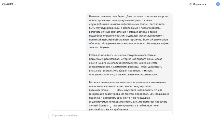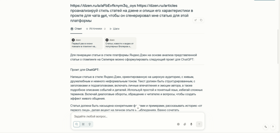 Процесс написания статьи был примерно таким же. Сначала я попросила Perplexity проанализировать статью с площадки dzen, поскольку «жизненные» посты на всех этих площадках обладают примерно одинаковыми характеристиками. Благодаря этому я получила промт для Chat GPT, в котором делался упор на дружелюбный и искренний тон текста, в котором стоит делать упор на свои эмоции и опыт. А также обязательно в финале добавить вопрос для читателя, который подтолкнёт его на дискуссию. Позже по той же схеме я попросила написать мне вопросы, ответы на которые позже стали бы основой статьи.