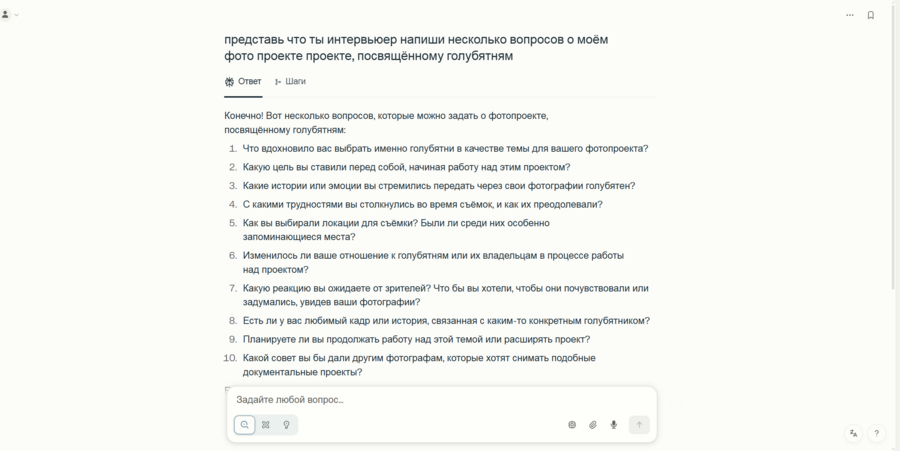 Далее я попросила нейросеть представить, что она журналист и задать мне вопросы о моём приложении, на которых могла бы основываться моя статья. После чего я выбрала интересны мне вопросы и развёрнуто ответила на них.