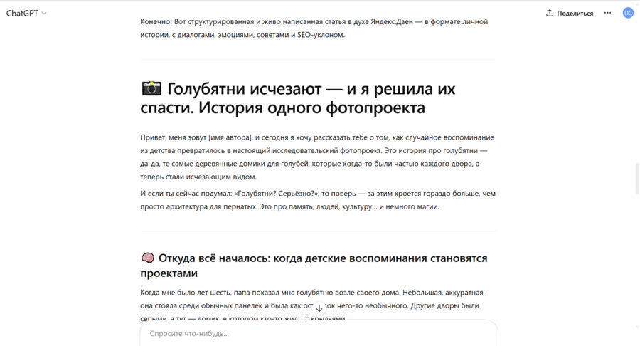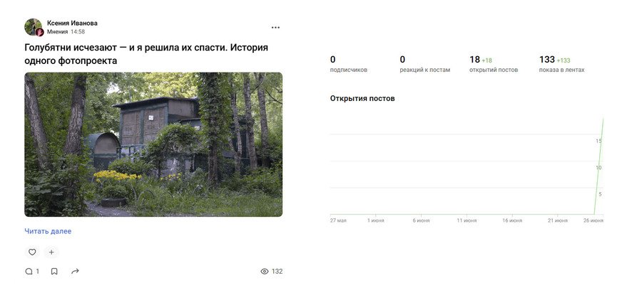 Так и появился второй заход на эту задачу с новым проектом. Меня расстроило отсутствие ярко выраженного результата со статьёй про POSTer. Потому проанализировав замечания искусственного интеллекта и также самостоятельно наблюдая за платформами, я поняла, что контент про дизайн и правда заходит у аудитории в редких случаях. И тут на кануне я сдала фотопроект про голубятни и решила чисто ради эксперимента попробовать продвинуть и его.