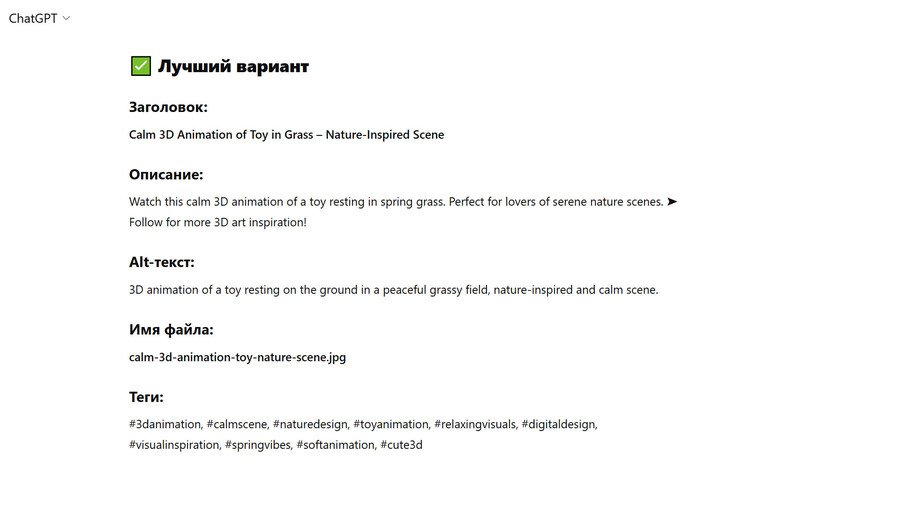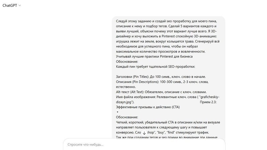После этого я собрала всю информацию, которую мне предоставила нейросеть Perplexity, а также выжимки из статьи про продвижение на Pinterest, которую нам предоставляли на курсе с требованиями к названию пина, описания, и соединила это всё в промте для Chat GPT. Я попросила искусственный интеллект сгенерировать 5 вариантов всей нужной информации для моего пина и выбрать лучший и объяснить почему.