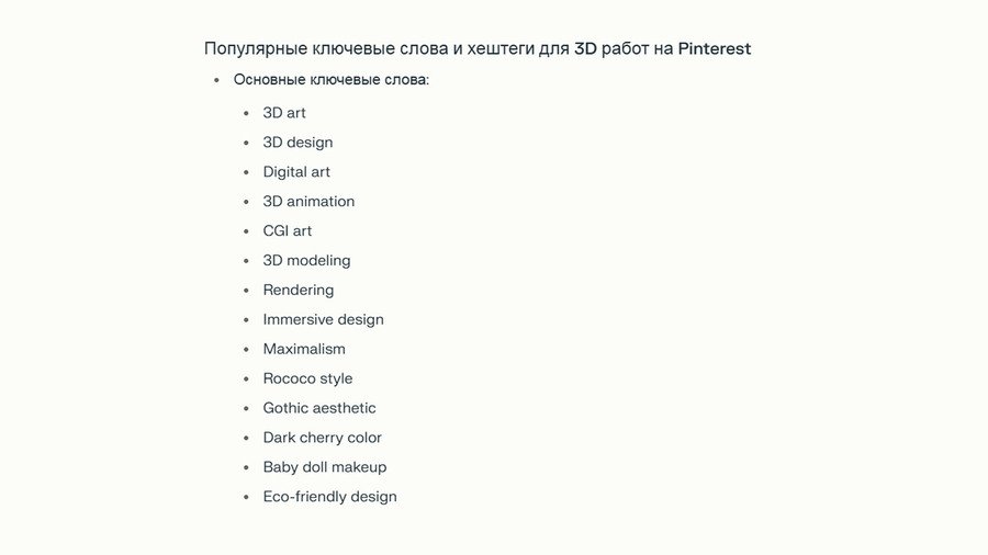 Для начала, зайдя в pinterest для бизнеса, я скопировала оттуда ссылку на статью про нынешние тренды на этой платформе и отправила её для анализа в Perplexity, попросив выделить основные тренды, ключевые слова и тэги, которые я смогла бы использовать для продвижения своей 3д работы.