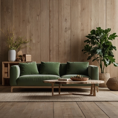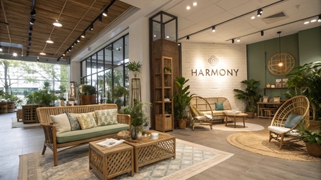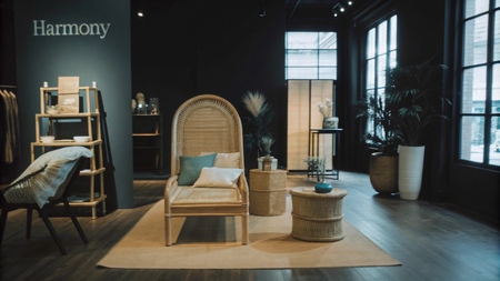 Create an image of a furniture store for the brand 'Harmony, ' showcasing a collection of nature-inspired furniture. The store should have a warm and inviting atmosphere, featuring pieces made from natural materials like wood and rattan. Display furniture in a subdued color palette, including soft greens, earthy browns, and neutral tones. Incorporate elements of nature, such as potted plants and natural light streaming through large windows. The overall design should reflect a sense of tranquility and harmony with nature, appealing to customers seeking elegant and sustainable home furnishings.