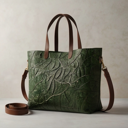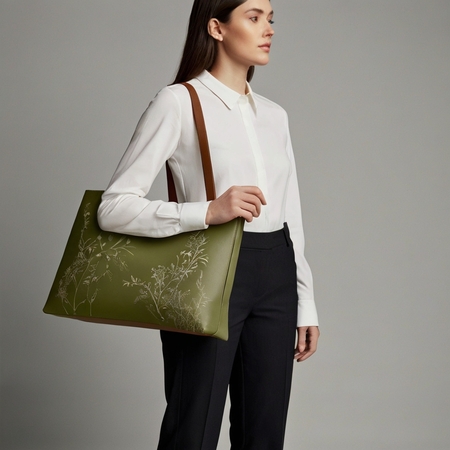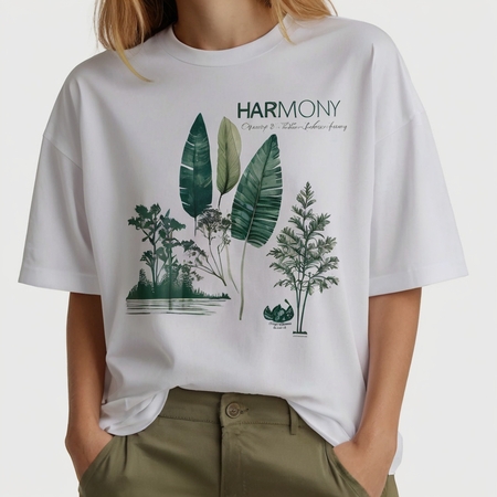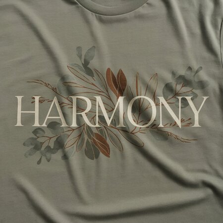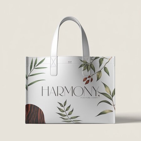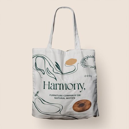 Design a stylish and nature-inspired tote bag for 'Harmony, ' a furniture company that creates furniture based on natural motifs. The design should feature organic, flowing lines and subtle references to nature, such as leaves, wood textures, or plant elements. Use earthy tones like soft greens, browns, and beiges, combined with a minimalist approach. The company name 'Harmony' should be displayed in a modern, elegant font, possibly integrated into the design as part of the nature-inspired elements. The bag should have a luxurious yet environmentally friendly vibe, reflecting the sustainable ethos of the company. The overall look should be simple, chic, and timeless, perfect for showcasing the company’s commitment to nature and craftsmanship.
