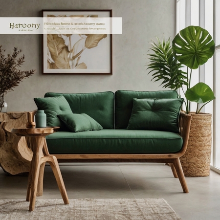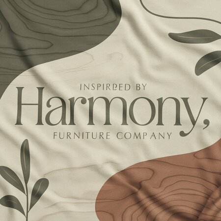 Create a sophisticated and elegant poster for a furniture company called 'Harmony'. The poster should reflect a blend of nature-inspired design and modern craftsmanship. Showcase furniture pieces that incorporate organic shapes, natural wood textures, and calming colors. The atmosphere should feel peaceful, natural, and earthy, with subtle accents of green, brown, and beige tones. Include elegant typography for the company name 'Harmony' in a clean, modern font. The design should evoke a sense of tranquility and connection to the outdoors, with elements like wood grain, plant motifs, and gentle curves. The overall aesthetic should feel luxurious yet grounded in nature.