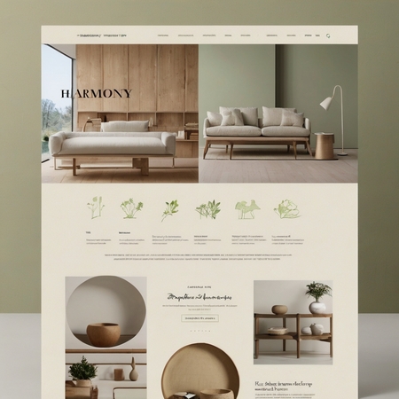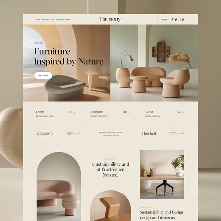 Design a clean, elegant website mockup for 'Harmony, ' a furniture company that creates furniture inspired by nature. The website should have a modern, minimalist aesthetic with a calming and natural feel. The color palette should include earthy tones such as soft greens, warm browns, beiges, and off-whites, with a focus on natural textures like wood grain or plant patterns. The homepage should feature high-quality images of furniture, showcasing the organic shapes and craftsmanship, with easy navigation to different product categories like 'Living Room, ' 'Bedroom, ' and 'Office.' Include a section for customer testimonials and a blog about sustainability and design inspiration. The typography should be sophisticated yet simple, with the company name 'Harmony' prominently displayed at the top. The website should have a smooth, user-friendly interface, evoking a sense of tranquility and connection to nature, while highlighting the company’s commitment to eco-friendly practices and natural materials.