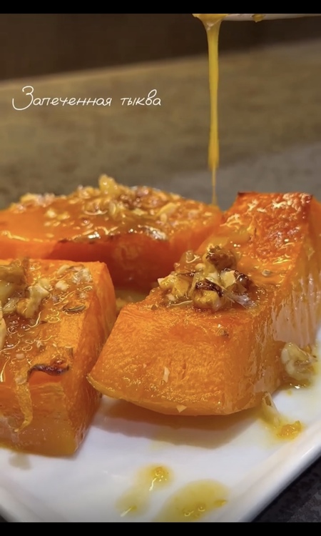 1 маленькой либо 0.5 большой тыквы почистить и нарезать на средние кусочки. Выкладываем в форму для запекания. 1 апельсин тщательно промываем, натираем на терке цедру, а сам сок полностью выжимаем. В сотейнике растапливаем 40-50 гр сливочного масла, добавляем 2 ложки меда, затем добавляем цедру апельсина и сам сок аппльсина. Смазываем тыкву сиропом, но часть сиропа оставляем. Посыпаем тыкву 2 чл сахара и отправляем в духовку на 180’ 35-40 минут. 6-8 грецких орехов чистим и мелко режем, посыпаем готовую тыкву орехами поливаем оставшимся сиропом и отправляем обратно в духовку на 20-25 минут.