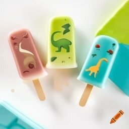 промпт: Three popsicles with different dinosaur designs on a white surface. gelato ice cream packs green and blue нейросеть: craiyon