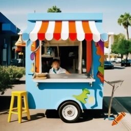 промпт: A small cart with a colorful canopy and stools that sells dinosaur ice cream нейросеть: craiyon