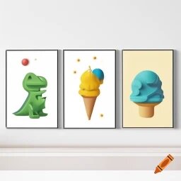 промпт: Three posters with the cartoon dinosaur character on a white background. ice cream advertisement in yellow, blue and red colors нейросеть: craiyon