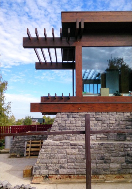 Реконструкция заброшенного строения на берегу Клязминского водохранилища под жилой дом. Проектом предусматривалось расширение площади здания, перепланировка, усиление с частичной заменой несущих конструкций и наружная отделка фасада. Был разработан проект интерьеров части помещений и благоустройства прилегающей территории.