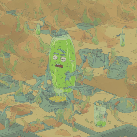 Из-за того, что в исходных изображения среди людей чаще всего были выделены только Рик с Морти, то некоторые предметы приняли лицо Рика. Мне кажется, получился бы отличный мерч: Рик-огурец, как бутылка для воды, и Рик-газировка.