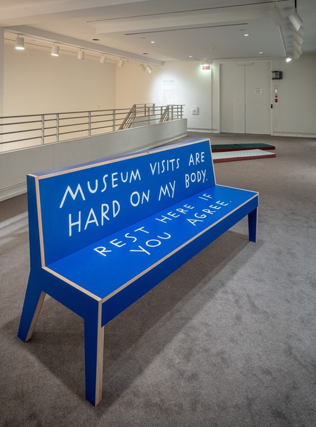 Проекты Шэннон Финнеган — это инсталляции и объекты, вторгшиеся в музейное или выставочное пространство: скамейки, стулья и подушки одинакового синего цвета. На сиденьях белым написаны фразы на разных языках: «Сюда непросто было попасть. Отдохните здесь, если согласны», или «Я бы предпочла посидеть. Присядьте, если согласны», или «На этой выставке приходится слишком долго стоять. Сядьте, если согласны». Помимо художественного высказывания эти объекты представляют собой места заботы, дружески-интимно беседующие с посетителями об усталости и приглашающие передохнуть. Отдых бывает нужен всем — как людям с особенностями здоровья, так и нормативно здоровым, особенно в современном обществе, где продуктивность является несомненной ценностью, и чтобы вопреки общественным требованиям (и традициям музейных институций) получать и проявлять заботу, требуется создавать места и технологии помощи.