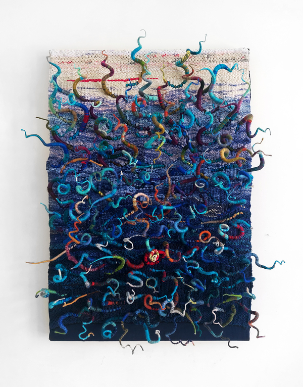 Обкрученная ниткой проволока, шерсть, хлопок, лен, текстиль (футболки покрашенные и порезанные), флис. Когда люди трогали «Ростки» на выставке, я радовалась. Я её так и задумывала, приглашающей к взаимодействию, подошёл посмотреть, подкрутил росточек и пошёл дальше. И работа все время меняется, живёт.