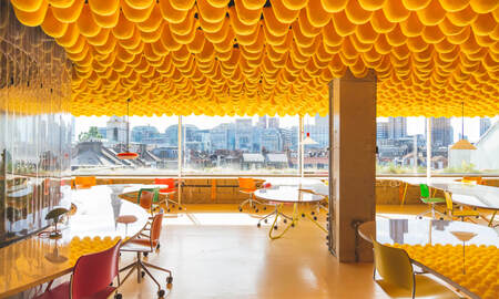 Гибкая планировка: Внутри — трансформируемая мебель: столы превращаются в скамьи для собраний, а часть стен — в маркерные доски.