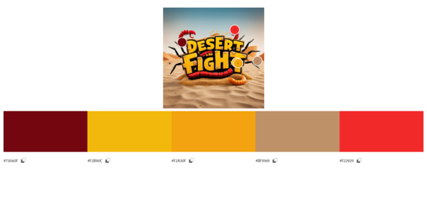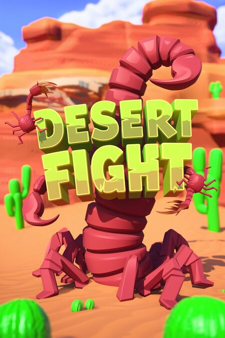 Cover prompt: A 3D render of a poster for a game called «Desert Fight». The logo is bold and dynamic. The game is set in a desert environment. The logo features the game’s title in large, playful, and slightly rugged letters. The text is surrounded by elements like a coiled scorpion tail, spider legs, and the silhouette of a giant worm bursting from the ground. The background is a desert landscape with sand dunes and cacti.