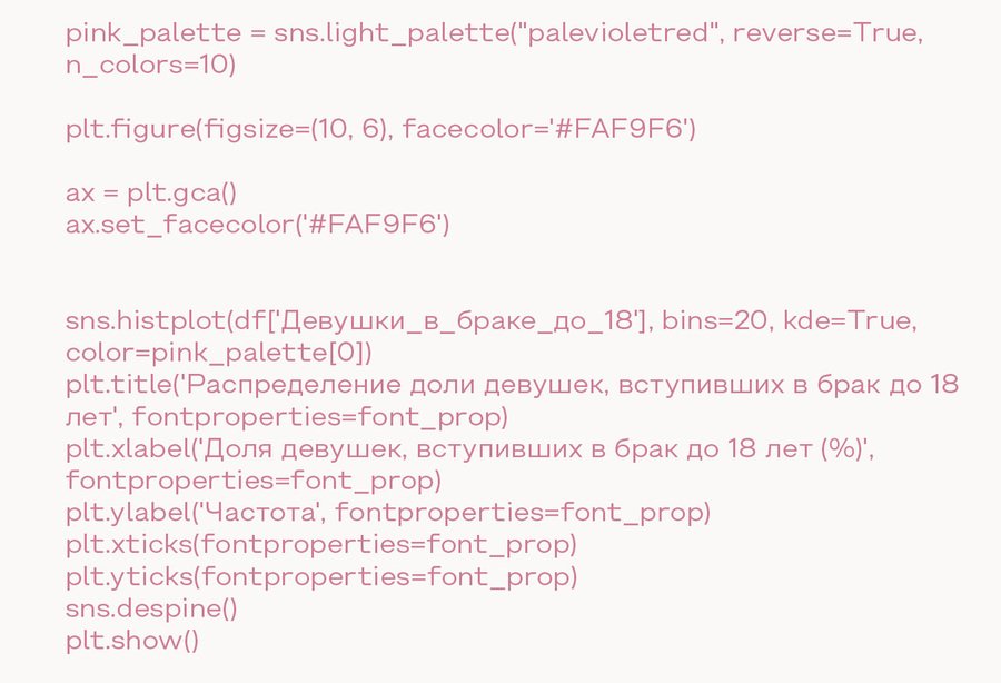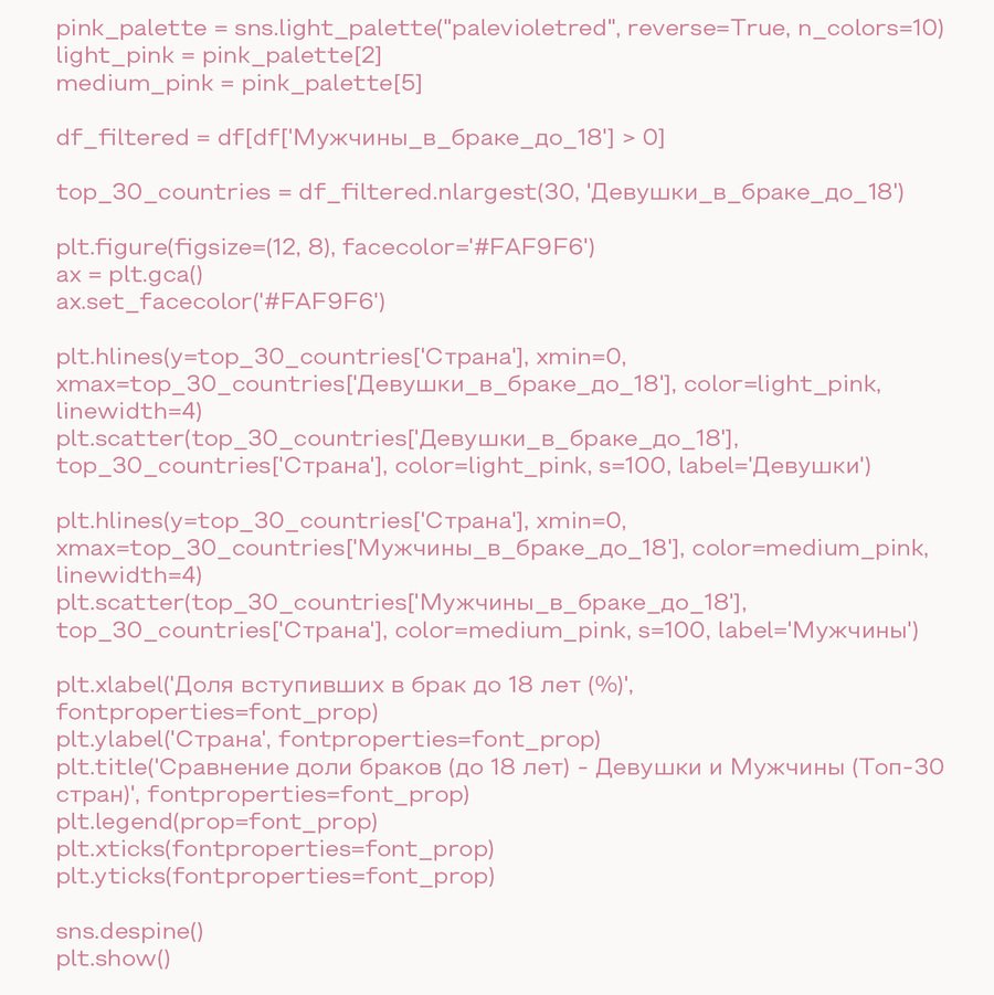 В исследовании было принято решение использовать светлые розовые оттенки для общего оформления проекта. Такой выбор был сделан с целью выделения и подчеркивания темы невинности детей, которые оказываются в условиях раннего брака. Светлые розовые тона были выбраны для создания визуального акцента, подчеркивающего эмоциональный аспект данной проблемы.